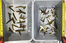 The physical coloration of coral is an easy way of identifying some pathogens, since many diseases are identified by their most obvious symptoms such as black band disease, white pox and yellow-band disease.[10] Sometimes diseases look identical on a macroscopic level, and need to be identified in other ways.[3][4][5] For example, multiple diseases cause a break in pigmentation, which gives the coral a white band. Since a white band is a similar symptom in different diseases, identification of those diseases can be difficult.[3] In these cases the diseases are labeled through the rate at which they affect the coral.[4][5] For white band diseases, their rates of tissue loss range from 0.1(cm/day) in white plague disease to 9(cm/d) in white band disease 2. White plague and white band disease 2 both have the same outward symptoms, but the rate at which they infect corals are drastically different, distinguishing them as different diseases.[4]
