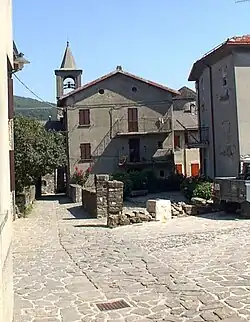 The church is dedicated to San Martino although it is no longer used for religious purposes; it presents an unusual façade with a bell tower held up by an archway that crosses over the street. A new church, financed by immigrants to America and France has been built on the village outskirts.