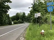 CR 512 intersects US 202 and turns northeast to form a concurrency with that route, passing between homes to the northwest and fields to the southeast. CR 512 splits from US 202 near the Far Hills Station by heading southeast on Liberty Corner Road. The route continues through a mix of fields and woods before turning south and then east in a wooded area. The road runs between more fields to the north and woods to the south before turning southeast and passing over I-287. At the Douglas Road intersection, CR 512 enters Bernards Township and heads south through wooded residential areas, making a sharp turn to the east. The route comes to an intersection with CR 640, where it turns south onto Valley Road, passing through woodland and fields. The road turns sharply to the east again and crosses CR 525. The route is briefly a four-lane road past CR 525, narrowing to two lanes at Spring Valley Road. The road passes through a mix of wooded neighborhoods and open fields before turning southeast into forested residential areas at the CR 613 junction. Upon intersecting CR 651, the route makes a turn to the northeast.[1][5]
