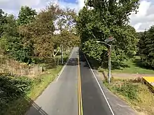 CR 546 begins at an intersection with Route 29 in Hopewell Township, heading northeast on two-lane undivided Washington Crossing-Pennington Road. Past Route 29, the road crosses over the Delaware River on the Washington Crossing Bridge and connects to PA 532 in Washington Crossing, Pennsylvania. CR 546 runs northeast from the western terminus into wooded areas of Washington Crossing State Park. After a turn to the east, the route crosses CR 579 and passes a mix of homes and farms. The road has intersections with CR 637 (Jacobs Creek Road) and CR 611 (Scotch Road) before crossing over CSX’s Trenton Subdivision. Immediately after the bridge, CR 546 has a junction with CR 631 (Ingleside Avenue) prior to reaching the Pennington Circle, a traffic circle, where it meets Route 31 and CR 640 (South Main Street).[1][2]