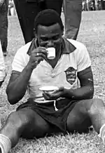 Coutinho with the Brazil national team while drinking a coffee on the pitch in 1962