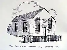 In September 1834, they bought a piece of ground in the "Quarry Piece", Cradley Heath. The first building was erected in December 1834, "a fine new chapel seated for about 300".[20] It was on the site of most of the present schoolroom. The gallery was added later. This extension is at the right-hand side of the above photograph. Neighbouring St Luke's Church was built in 1847.