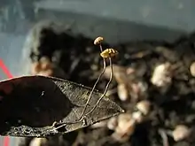- ↑ Moreau P-A, Vila J, Aime MC, Antonín V, Horak E, Pérez-Butrón JL, Richard F, Urban A, Welti S, Vizzini A (2015). "Cibaomyces and Cyptotrama, two new genera for Europe, and an emendation of Rhizomarasmius (Basidiomycota, Physalacriaceae)". Mycological Progress. 14 (2). doi:10.1007/s11557-015-1024-4. hdl:2318/153555. S2CID 14276031.