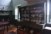 Potatoes were a staple garden vegetable and would be roasted or boiled. One example of a potato dish which Tibbott has recorded is called Cig ar wyneb tato, this is a dish of roast potatoes (Tato Rhost) where the potatoes are part boiled in a heavy saucepan and then covered with bacon rashers, with a thick layer of chopped onions or chives placed on top. The pan is covered with a closely fitting lid and cooked with a little water for half an hour, so that the bacon fat browns the potatoes at the bottom of the pan. On churning day the dish would be served with buttermilk (Tato rhost a llaeth enwyn). The meal is cooked without the need for much supervision and was usually made in a ffwrn fach over an open fire.[27]