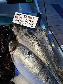 Sea trout (Sewin) caught by coracle in Carmarthenshire and on sale at Swansea Market.