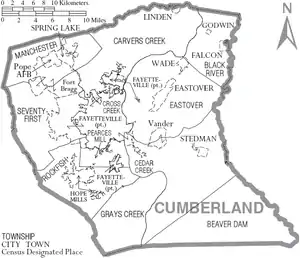 Cumberland County is a county located in the U.S. state of North Carolina. As of the 2020 census, the population was 334,728,[1] making it the fifth-most populous county in North Carolina. Its county seat is Fayetteville.[2] Cumberland County is part of the Fayetteville, NC Metropolitan Statistical Area.