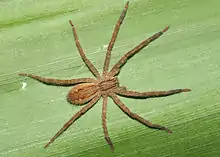 As Cupiennius salei does not produce any dedicated prey capture web, their bite effect plays an important part of their hunting strategy alongside grasping with the chelicerae, forelegs and pedipalps. Both ambush and pursuit are key parts of active prey capture. They prey on a wide range of invertebrates especially insects (moths, earwigs, cockroaches, flies, grasshoppers, etc), and small vertebrates such as frogs and lizards.[12] Without any dedicated web for prey capture, they therefore depend entirely on body mechanics and venom for predation. They produces a neurotoxic venom which is composed of a complex mixture of at least 286 compounds and 49 novel proteins.[13] In addition, there are many low molecular compounds, nine neurotoxic acting peptides (CSTX), at least eight neurotoxic and cytolytic acting peptides (collectively called cupiennins), highly active hyaluronidases.[1] The most powerful neurotoxin is a peptide called CsTx-1.[3] In 2002 a new family of peptides called cupiennins (cupiennin 1a, cupiennin 1b, cupiennin 1c, cupiennin 1d) was discovered from the venom, all composed of 35 amino acid residues, and have high antimicrobial activities.[14] It was subsequently discovered that the cupiennins are broad-spectrum bioactive compounds having bactericidal, insecticidal and haemolytic activities.[15]