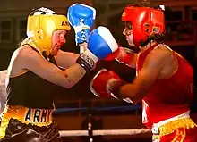 PFC Raelina Shinn (left) battles on with a nosebleed during the first female fight in the Armed Forces Boxing Championships.