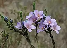 Cyanothamnus coerulescens, commonly known as blue boronia,[2] is a plant in the citrus family, Rutaceae and is endemic to southern Australia. It is a small, spindly shrub with glandular stems, small, more or less cylindrical leaves and blue to pinkish mauve, four-petalled flowers. There are two subspecies endemic to Western Australia and a third that also occurs in three eastern states.