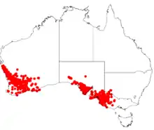 Blue boronia grows in mallee woodland. Subspecies coerulescens occurs in the south-west of Western Australia, in South Australia, Victoria and in the far south-west of New South Wales. Subspecies spicata occurs in Western Australia between Wubin and Muntadgin and spinescens is found in similar areas to subspecies coerulescens but only in Western Australia.[2][3][5][13]