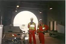 During one Sunday in October 1993, Wally Michalski and Mike Turner, working as contractors on the British side, used a pair of the Saracen bicycles to cycle the 100-kilometre (62 mi) round-trip from Folkestone to Coquelles and back again. The pair took around five hours to complete the journey, while wearing full overalls and needing to carry respirators.[3][4]
