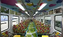 The train has three themed cars: "Peace Car" with a rusty steam train motif symbolizing the separation of the Korean peninsula, "Harmony Car", with paintings of red and blue figurines holding hands, and "Love Car" with paintings of adults and children from across the globe, also, holding hands. Inside the cars, ceilings are covered with pinwheels, and walls display photographs of the DMZ, with themes of war, trains, and ecology.[2][9]