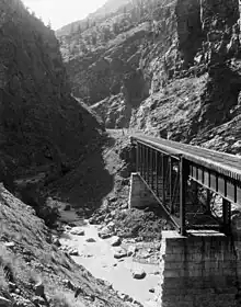 The Pratt Truss-style bridge was constructed in 1895 by the Denver and Rio Grande Railroad, as part of the railroad's narrow gauge passenger and freight route between Gunnison and Montrose in Western Colorado.[2] Crossing the turbulent Cimarron River just upstream from its confluence with the Gunnison River, the trestle replaced a wooden trestle built during the route's construction in 1882. Originally 288 feet (88 m) long, only the central span of it remains today. [3] The last remaining Trestle on the route after the abandonment of the line in the 1950s and the inundation of the Gunnison in the 1960s, the structure was listed on the National Register of Historic Places in 1976.