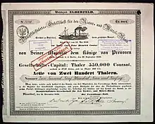 The joint-stock company Dampfschiffahrts-Gesellschaft für den Nieder- und Mittelrhein zu Düsseldorf was approved for an unlimited duration on 22 September 1836. Among the founders was Daniel von der Heydt. The share capital had a nominal value of 550,000 Thaler and was divided over 2,750 shares of 200 Thaler. The shares were listed on the Kölner Börse. In 1868 the company had a gross revenue of 303,000 Thaler and made a net profit of 71,000 Talern.[1]