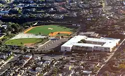 - ↑ Aerial photographs from c. 1941 show a partially completed school, but with some of today's wings missing. Review of Point Loma High School yearbooks of the era shows all six grades present at Point Loma HS through 1941. The 1942 Point Loma HS yearbook shows no seventh grade, which implies that the 1941-42 seventh graders were at Dana. The 1943, 1944, and 1945 yearbooks show only grades 9-12, so presumably Dana functioned as a grades 7-8 middle school in those academic years. Starting with the 1946 Point Loma HS yearbook, only grades 10-12 appear, so from 1945-46 onward, Dana evidently served grades 7, 8, and 9, with Point Loma HS serving grades 10-12.