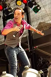 A brown-haired man with a beard and multiple tattoos performing on stage in a white shirt. He is holding a black microphone.