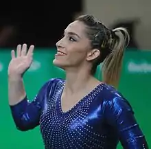 Daniele Matias Hypólito (born 8 September 1984) is a Brazilian gymnast who competed at the 2000, 2004, 2008, 2012 and the 2016 Olympic Games.[3] Hypólito is the first gymnast from Brazil to win a medal at the World Championships, a silver in floor exercise in 2001.[4] She is also the nine-time senior all-around Brazilian national champion in artistic gymnastics, 2002 South American Games all-around champion and 2003 Pan American Games all-around bronze medalist. To date, Hypólito has won the Brazilian National Championships more than ten times; represented Brazil at the World Championships thirteen times, competing in every championship from 1999 to 2015, except in 2009; taken part in every edition of the Olympic Games from 2000 to 2016; and competed at five Pan American Games between 1999 and 2015.