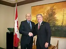 Williams' popularity increased when he fought with then Canadian Prime Minister Paul Martin over a campaign promise Martin had made that would lead to a revised Atlantic Accord.[23] Martin proposed an eight-year deal that the province would keep 100 percent of offshore oil revenues, but with an expenditure a cap to keep the province from surpassing the per capita tax revenue of Ontario. Williams, supported by the other provincial leaders, walked out of talks with Martin, saying that cap would cost the provincial government billions of dollars in lost revenue over the life of its three oil fields.[23][24] Williams along with Nova Scotia Premier John Hamm, who also wanted the same deal as Newfoundland and Labrador, met with the Prime Minister on several occasions but a deal between Ottawa and the two provinces could not be reached.[25] Williams raised the temperature on December 23, 2004, when he ordered the removal of all Canadian flags from provincial government buildings.[26][5][27] On January 10, 2005, Canadian flags started flying once again in the province, and several weeks later Newfoundland and Labrador and Nova Scotia reached a deal with Ottawa.[28][29][30] A March opinion poll indicated that support for the Williams government had rebounded to 86 percent.[31]