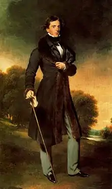 David Lyon senior (1754–1827) was a successful West Indies merchant. He was descended from William Lyon of Pettanys (1433–1498) progenitor of the Easter Ogil branch (Burkes L.G. 1906), 3rd son of Patrick Lyon 1st Lord Glamis (1402–1459). With his wife Isabella Read (1776–1836) he had ten children, of whom David was the third, born on 8 April 1872. David junior was educated at Harrow (1809).[1] In 1825, aged 31, his portrait was painted by Sir Thomas Lawrence, then president of the Royal Academy and at the peak of his career. Lawrence was paid for the painting in 1828, which would seem to have cost the high sum of 700 guineas.[2] His father, David Lyon senior, also had his portrait painted by Lawrence, but the whereabouts of this portrait is unknown.[3]