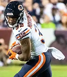 Montgomery made his NFL debut with the Chicago Bears in Week 1 against the Green Bay Packers. In that game, Montgomery rushed for 18 yards on six attempts and caught one pass for 27 yards as the Bears lost 10–3.[32] In Week 2 against the Denver Broncos, Montgomery rushed 18 times for 62 yards and his first career NFL touchdown as the Bears won 16–14.[33] Though utilized more than teammate Tarik Cohen, Montgomery failed to reach 70 yards in any of the Bears' first seven games. After 11 carries for 25 yards in Week 6 and two rushes for six yards and a fumble in Week 7 against the New Orleans Saints, Montgomery responded in Week 8 against the Los Angeles Chargers with 27 rushes for an NFL-second best 135 yards and a touchdown in the 17–16 loss.[34] In Week 9 against the Philadelphia Eagles, Montgomery rushed 14 times for 40 yards and two touchdowns in the 22–14 loss. This was Montgomery's first game with multiple rushing touchdowns of his career.[35] In Week 17 against the Minnesota Vikings, Montgomery rushed 23 times for 113 yards and a touchdown during the 21–19 win.[36] Overall, Montgomery finished his rookie season with 889 rushing yards and six rushing touchdowns to go along with 25 receptions for 185 receiving yards and one receiving touchdown.[37]