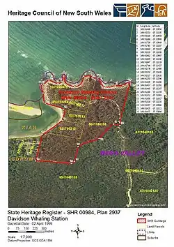 1. 1 2 3 4 5 6 7 8 9 10 11 12 13 14 15 16 17 18 19 20 21 22 23 24 25 26 27 28 29 30 31 32 33 "Davidson Whaling Station". New South Wales State Heritage Register. Department of Planning & Environment. H00984. Retrieved 2 June 2018. Text is licensed by State of New South Wales (Department of Planning and Environment) under CC-BY 4.0 licence.