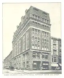 His brother Gilman Collamore (1834—1888) came to join him in 1854. Gilman established his own business in 1861. Gilman Collamore & Co., in premises at 731 Broadway in 1861, then occupied premises in Union Square before taking two storeys of showrooms in The Wilbraham, a fashionable block of bachelor flats at Fifth Avenue and 30th Street, that opened in 1890; about 1920 new premises were constructed for the firm at 15 East 56th Street[5]