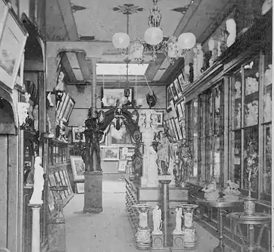 De Vries, Ibarra & Co. (c. 1864-1870) were "importers of paintings, engravings, bronzes, and works of art in general," "publishers of busts and statuary," and "importers and publishers of books in foreign languages."[1] Based in Boston, Massachusetts, in the 1860s the firm kept a shop in the Albion Hotel building on Beacon Street (corner Tremont Street),[2][3] and later on Tremont Street (between West Street and Temple Place). Proprietors included Guy Horvath De Vries[4][5] and Mrs. De Vries.[6] Staff included Carl Schoenhof, who bought the firm in 1870.