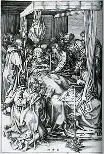 Van der Goes was a highly progressive and original artist, but at the same time heavily influenced by both contemporary and predecessor artists. Inspiration for this work can be detected in Petrus Christus' c 1457–67 Death of the Virgin[11][5] and by works attributed to the workshop of Rogier van der Weyden.[12] The painting bears striking similarity to Martin Schongauer's c 1470–75 engraving of the same name, especially in its overall tone and mood, the depiction of Mary and the representation of the apostles seated to Mary's left. Yet there are significant differences; the bed in Schongauer's engraving is canopied and the distribution of the apostles is very different in the two works. The Schongauer is dated to at latest 1475, and it is a matter of significant and at times harsh and divisive critical debate as to which work came first (see above).[12]