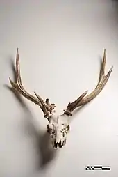 The fallow deer and the various subspecies of the reindeer have the largest as well as the heaviest antlers, both in absolute terms as well as in proportion to body mass (an average of eight grams per kilogram of body mass);[30][32] the tufted deer, on the other hand, has the smallest antlers of all deer, while the pudú has the lightest antlers with respect to body mass (0.6 g per kilogram of body mass).[30] The structure of antlers show considerable variation; while fallow deer and elk antlers are palmate (with a broad central portion), white-tailed deer antlers include a series of tines sprouting upward from a forward-curving main beam, and those of the pudú are mere spikes.[14] Antler development begins from the pedicel, a bony structure that appears on the top of the skull by the time the animal is a year old. The pedicel gives rise to a spiky antler the following year, that is replaced by a branched antler in the third year. This process of losing a set of antlers to develop a larger and more branched set continues for the rest of the life.[30] The antlers emerge as soft tissues (known as velvet antlers) and progressively harden into bony structures (known as hard antlers), following mineralisation and blockage of blood vessels in the tissue, from the tip to the base.[33]