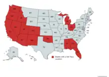 The chain operates in 15 US states, 1 US Territory (Guam), and had 594 locations as of May 1, 2023.[2] The majority of their restaurants are in California. Del Taco also operates in several other states, including Alabama, Arizona, Colorado, Florida, Georgia, Idaho, Michigan, Nevada, New Mexico, Ohio, Oklahoma, Oregon, Utah and Washington. The company has a handful of locations east of the Mississippi.