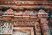 The fort temples are dominated by the Jain temples in the eastern part of the hill fort; the Jaina images here are mostly of the "iconographic and the stylistic variety".[5] The Jain complex was built during 8th to the 17th century and consist of 40 Jain temples housing around 2,000 sculptures which is largest such collection in world.[13] The Jain temples have a large number of panels depicting scenes from Jain mythology, Tirthankara images and votive tablets. The pillars are carved with a thousand Jain figures.[14]