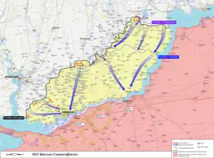 The flooding was widely expected to hinder a planned Ukrainian counteroffensive by making it harder for the Ukrainian army to cross the Dnieper River into Russian-occupied territory.[139][140] Vladimir Saldo, the Russian-installed governor of occupied Kherson, said the breach would help Russian forces defend the area, saying, "In military terms, the situation has worked out in a way that is operationally and tactically in favour of Russian forces".[141]