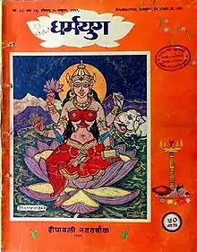 The magazine was originally published by a Dalmia press in Bombay from 1949, just after independence of India, however it incorporated an earlier pictorial magazine Nav Yug that began in 1932.[3][4] Later on when the Dalmia group divested its stake from Bennett, Coleman & Co. Ltd. in 1948, Dharmayug remained with the Times of India group.[5] One of its chief editors was Pandit Satyakam Vidyalankar,[6] The magazine became popular and widely read when, in 1960, noted writer-playwright Dharmveer Bharti noted for his play, Andha Yug (1953), was appointed as its Chief Editor.[7] The noted Hindi poet and author served as the chief editor for the magazine from 1960 to 1987.[8] Dharmveer Bharti was a dedicated and widely admired editor, although was sometimes considered to have been authoritative by fellow journalists.[9] After Bharti's retirement, Ganesh Mantri, a Hindi journalist, was appointed Editor,[8] Vishwanath Sachdev took over from Ganesh Mantri, before the Times of India decided to close down the magazine in 1997.[10][11][12]