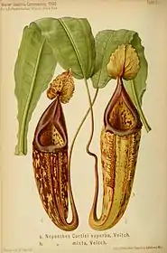 A number of taxon names that Beck did not recognise as valid nonetheless appeared in print for the first time in his monograph. These included the species synonyms N. edgeworthii (synonym of N. edwardsiana) and N. speciosa (synonym of N. distillatoria), as well as the hybrid synonyms N. anerleyense and N. arnoldiense (both synonyms of N. × stewartii).[4] While the name N. hookerae had first appeared in the literature four years prior to Beck's work, his concept of this hybrid involved a more complex cross (N. mirabilis × (N. rafflesiana × N. ampullaria)); it is considered a later synonym of N. × stewartii.[4]