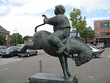 Statue of Dik Trom, riding a donkey backwards, a classic depiction of Dik Trom (artist: Nico Onkenhout)