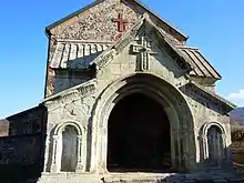 Sometime between 1213 and 1222, in the reign of George IV of Georgia, a narthex was added on the western end of the basilica. The narthex is richly adorned with ornamental stone-carvings in relief and covered with a vault, supported by four pillars and arches; its all three facades, columns, and arches are faced with light green smoothly hewn stone slabs. To the north of the church stands a rectangular bell-tower, remodeled several times.[1] Farther, to the northeast, there is small single-nave church of Saint Marina, rebuilt in 1702 by Isakhar, a caregiver for Princess Mariam of Kartli.[4]