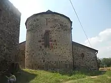 The church, without later additions and narthex, measures 23 × 11.5 m. It is built of lines of small grayish stones, sometimes regularly hewn blocks, and is roofed with flat stone tiles. As the building has been reconstructed in the course of history, only the middle nave retains its original architectural form. It terminates in a protruding semicircular apse on the east and exaggerated engaged pilasters in the interior of the building create arched bays in between. The inner walls were once fully frescoed; the badly damaged 13th–14th-century depictions of the Mandylion, saints and inscriptions survive in the altar apse; fragments of a royal portrait and two scenes of the Doomsday are visible in the northeastern and northwestern pilasters, respectively. A small flagstone in the south wall of the altar bears a carving in relief, depicting two laymen standing en face, with a pedestalled cross in between them. Two side annexes, on the south and north, respectively, are 9th–10th-century structures, containing a sacristy and prothesis, both with apses.[1]