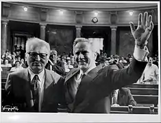 Between 1961 and 1962, Ćosić got involved in a lengthy polemic with the Slovenian intellectual Dušan Pirjevec regarding the relationship between autonomy, nationalism and centralism in Yugoslavia.[11] Pirjevec voiced the opinions of the Communist Party of Slovenia which supported a more decentralized development of Yugoslavia with respect for local autonomies, while Ćosić argued for a stronger role of the Federal authorities, warning against the rise of peripheral nationalisms. The polemic, which was the first public and open confrontation of different visions within the Yugoslav Communist Party after World War II, ended with Tito's support of Ćosić's arguments. Nevertheless, actual political measures undertaken after 1962 actually followed the positions voiced by Pirjevec and the Slovenian Communist leadership.[11] Precipitated by a slow economy, opposing sides came to use Ćosić and Pirjevec as proxies in their battles for a competing vision of Yugoslavia in the early to mid-1960s.[6]