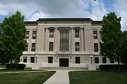 The county's first court session was held in an Illinois Central depot, and later sessions in two different commercial buildings, including one rented by the county recorder.[1]: 33 The initial purpose-built courthouse was a small wooden building, which was erected at private expense.[2] Construction began in 1864 on the second courthouse, a two-story brick building with sheriff's house and jail in the basement.[1]: 33 O.L. Kinney, the Chicago architect responsible for the design, projected a $15,000 cost, but the final cost amounted to nearly three times that estimate.[1]: 34 Further costs appeared on an annual basis, due to numerous problems that required expensive maintenance, and the placement of the jail inside the courthouse was eventually deemed unsafe to use. Consequently, the current courthouse was built in its place over a two-year period, beginning in 1911 and being completed in 1913. A stone Neoclassical structure with a three-part facade featuring Ionic columns in the center, it cost approximately $170,000 to complete.[2]