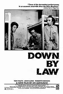 Down by Law is a 1986 American black-and-white independent neo-beat noir comedy film[2] written and directed by Jim Jarmusch and starring Tom Waits, John Lurie, and Roberto Benigni.
