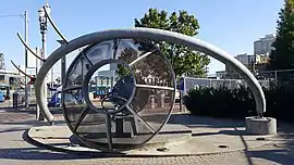 The galvanized steel sculpture by Don Merkt is installed at the intersection of Northwest 5th Avenue and Irving Street has been, along the Transit Mall in Old Town Chinatown. It has described as a "large abstracted eye" that focuses on Portland Union Station's clock tower, "or more metaphorically time".[1] The artwork measures 10 feet (3.0 m) x 27 feet (8.2 m) and is categorized by the Smithsonian Institution as both abstract and architectural.[2] Behind the eye's iris is a steering wheel and seat, accessible to visitors. The seat's reverse is an inverted replica of the clock face.[1][2] Merkt has described the work as being about "social responsibility and that shared sensation of steering something greater than yourself through time, whether it be a bus, a family, a community or a culture. The sculpture can be seen as a collective 'I' or 'eye', a living populist sculpture that cameos whoever takes the wheel."[1]