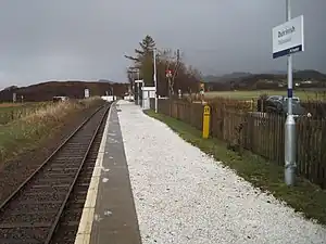 Duirinish railway station is a remote railway station on the Kyle of Lochalsh Line near the settlement of Duirinish in the Highlands, northern Scotland. The station is approximately 2 miles (3 km) inland of Scotland's west coast, near Loch Lundie. The station is 59 miles 58 chains (96.1 km) from Dingwall, between Kyle of Lochalsh and Plockton.[4] ScotRail, who manage the station, operate all services here.