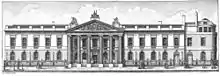 In 1648, therefore, it took a lease on the adjoining property, Craven House, a late Elizabethan mansion built by Sir Robert Lee, Lord Mayor of London, and named after one of his successors, Sir William Craven, who had occupied it at a later date.[4][5] By 1661 the building was known as East India House. In that year, the frontage was given an ornamental wooden superstructure decorated with paintings of some of the Company's ships, and surmounted by a wooden sculpture of a seaman.[6] Over the years following, various improvements and extensions were made to the premises; and in 1710 a contract was signed for the company to buy the property from Lord Craven (although the purchase was not in fact completed until 1733).[7] Further extensions were made, but by the mid-1720s the mansion was considered to be in such poor condition, and the company's need for additional space so pressing, as to justify complete rebuilding.[8] To allow this to take place, the Company moved into temporary premises in Fenchurch Street early in 1726.[9]