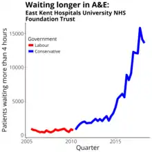 In October 2017 after months of very poor performance against the A&E four hour target it was clearly the worst performing trust in England on A&E in 2017–18, with around 30%t of patients waiting over four hours. The chair of the trust, Nikki Cole, resigned and was replaced by Peter Carter.[14] In 2017–18 East Kent Hospitals saw 74.3% of A&E patients within four hours.[15]