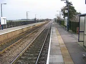 The station is unstaffed and has no permanent buildings other than basic shelters (the former station house is now a private residence). No ticketing facilities are offered, so all tickets must be bought on the train or prior to travel. Train running information can be obtained from timetable posters or a public telephone on platform 2. Step-free access is available to both platforms via the automatic barrier level crossing at the eastern end.[2]