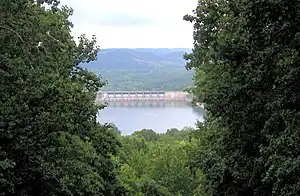 The Caney Fork has long been notorious for its volatility. In the late 19th and early 20th centuries, business venture after business venture tried to harness the river's power, only to be defeated by one of several catastrophic floods that occurred along the river during this period.[8] Major floods in 1902, 1915, 1928, and 1929 wiped out mills, bridges, houses, and farms, and led to increased calls for flood control. In the 1930s, the U.S. Army Corps of Engineers initiated several flood control projects in the Cumberland River watershed, including Center Hill Dam, the construction of which was authorized in 1938. Flood control and power production were the primary goals of the Center Hill Dam project.[9]