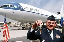 Commander of The Eight Air Force Lieutenant General Edgar S. Harris Jr. holds the keys of the brand new advanced tanker/cargo aircraft McDonnell-Douglas KC-10 Extender delivered to the United States Air Force Strategic Air Command.