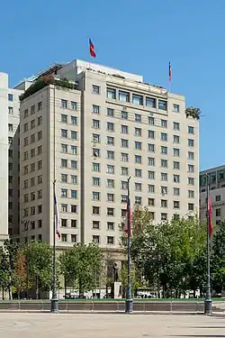 The Hotel Carrera was designed in the Art Deco style by architects Josué Smith Solar and José Smith Miller, as part of the creation of a Civic District centered around La Moneda Palace.[2] Opened in 1940, it was one of the first multi-story buildings constructed from reinforced concrete in Chile.[3] The 17-story hotel had two basement levels and a rooftop swimming pool for the guests, among them the most notable being Elizabeth II and Pope John Paul II.