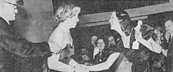 Jussi Award 1950. Journalist, singer and actress Annikki Arni (left) has handed Jussi Award to actress Eeva-Kaarina Volanen