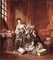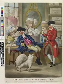 In 1747, The London Tradesman (a guide to the trades) gave a list of a milliner's responsibilities: "The Milliner is concerned in making and providing the Ladies with Linen of all sorts, fit for Wearing Apparel, from the Holland Smock to the Tippet...the Milliner furnishes them with Holland, Cambrickm Lawn and Lace of all sorts and makes these Materials into Smocks, Aprons, Tippers, Handkerchiefs, Neckties, Ruffles, Mobs, Caps. The make up Cloaks, Manteels, Mantelets, Cheens and Capucheens of Silk, Velvet, plain or brocaded and trim them with Silver and Gold Lace or Black Lace. They make up and sell Hats, Hoods, and Caps of all Sorts and Materials; they find them in Gloves, Muffs and Ribbons: they sell Petticoats and Hoops of all Sizes."[16] In the seventeenth century, milliners were predominantly men but a change in fashionable dress for women led to milliners being mostly women. The mantua, an open front gown with a loose-fitting unboned bodice cut all in one piece with the skirt, much like an over robe became popular. The gown was worn over a corset and petticoat and the skirts of the gown were draped up to reveal the petticoat. The mantua started as an informal at-home gown but evolved into a more formal style that became acceptable at court.[17] The gap in the front of the bodice was filled in with a stomacher which were often covered with lace, ribbons, and various other trimmings. Previously, most women's clothing had been made by tailors but this new style was easier to make and seamstresses moved into making mantuas. Before this seamstresses mostly made simple items such as shirts, chemises, cuffs, and collars. Even as the style of the mantua became more complicated and went out of style, women continued to make all sorts of clothing for women and the term mantuamaker became synonymous with dressmaker.